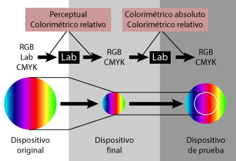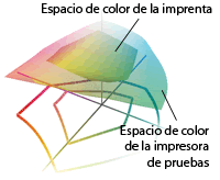 1.Si los colores del resultado final caen fuera de la gama de tonos que la impresora puede reproducir, no será posible representarlos (con lo cual no habrá prueba). Dicho de otro modo: El espacio de color representado por el perfil de la impresora debe abarcar el espacio de color representado por el perfil del dispositivo final para poder representar los colores posibles..