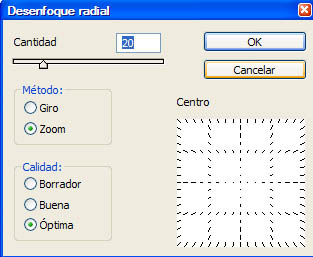 Después vamos a Filtro/Desenfocar/Desenfoque Radial y ponemos estos datos.