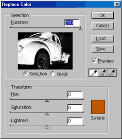 8. Con el Cuenta Gotas, pulsamos sobre una de las partes del coche que tenga el color que queremos cambiar, y modificamos el Tono, Saturación y Luminosidad del mismo.