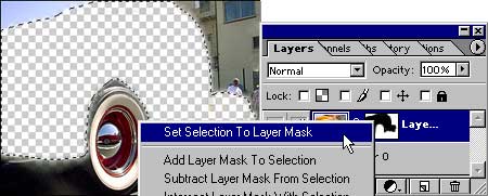 5. Una vez tienes todo el coche borrado (pintado en el Layer Mask), pulsa con el derecho del Mouse sobre el Layer Mask y elige SET SELECCTIÓN TO LAYER MASK, lo cual nos cargará la selección de la mascara, y la invertimos con Shift+Ctrl+I, o <Select/Inverse>