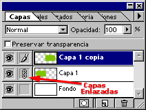 Ahora hay que unir la capas, para eso hay que hacer un click en el pequeño casillero que indica la imagen de la izquierda, de esta forma aparece una cadenita y las capas quedan "enlazadas", ahora presionando las teclas Ctrl y E las capas enlazadas se unen y forman una única capa.