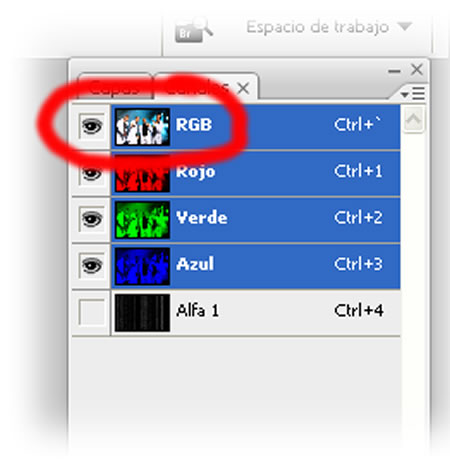 8. Bueno damos click en el canal RGB para poder pasar con las capas ahora