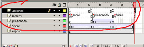 11. Cree una nueva capa, coloquele el nombre de marcas, seleccione el primer frame de la capay en la barra de propiedades en la casilla FOTOGRAMA coloquele el nombre de reposo, seleccione el segundo cuadro de la capa marcas oprima la tecla F6 y coloque el nombre de SOBRE en la barra de propiedades, de igual forma hagalo con los otros dos cuadros como lo demuestra la imagen.