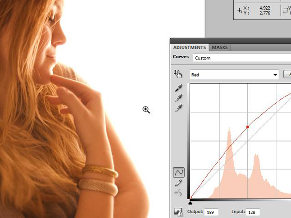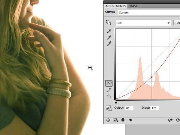 En mis opciones de canales, escogí Roja (canal rojo). En la parte inferior de la ventana de mi Tengo dos números - Salida y Entrada.El número de entrada es una representación matemática de mi color mientras que el número de salida es una representación matemática del color después de mi ajuste de color. El punto rojo en la paleta de curvas representa la posición de estos números. Elegí el color correcto de la imagen en los tonos medios y el motivo para que el número de entrada es igual a 128 (los tonos medios van desde unos 128 a cerca de 132).
