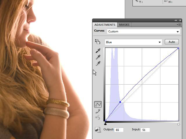 De color amarillo es más visible en las partes más oscuras de mi imagen. Con mi herramienta Eyedropper, me señaló una de las partes y mi número de entrada en la paleta de Curvas señaló a 51. Ya que la imagen es demasiado amarillo debo añadir azul para que sea neutral. Para añadir el color azul a mi imagen, tengo que cambiar el número de salida superior a la de 51.