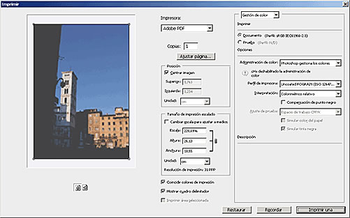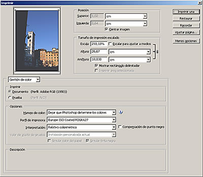 En la versión CS3, que puedes ver en la imagen superior, las novedades en administración del color están en la columna central. Se puede elegir la impresora y el número de copias, y se puede ver la resolución de impresión.