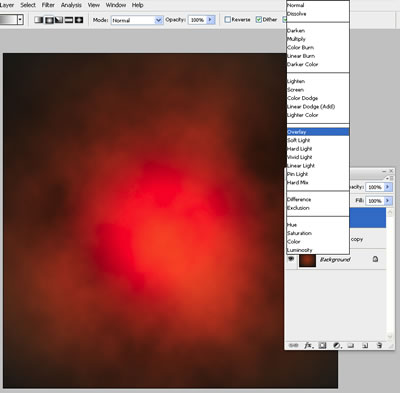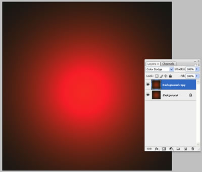 2. En este tutorial, en realidad necesita un centro muy intenso, por lo que lo que vamos a hacer es duplicar la capa que acaba de formular y establecer el precedente de un modo de mezcla de "Color Dodge". Hay algunos tipos de modos de mezcla, oscurecimiento, rayo, y los colourizing invertir. Color Dodge es probablemente el stronges del rayo. Como se puede ver en la captura de pantalla se produce en un centro bastante completo.