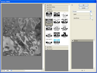 Así que vaya a Filter> Sketch> Chrome y utilizar la configuración por defecto de 4 y 7 de detalle y suavidad, respectivamente. En realidad, probablemente pueda ensuciar alrededor con los que si se quiere, pero las opciones por defecto parece estar bien.