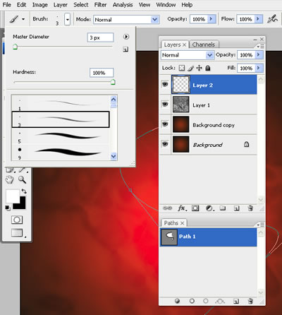 6. Una vez que usted tiene una bonita curva, crear una nueva capa. A continuación, haga clic en la herramienta pincel (B) y elegir una muy fina, cepillo duro. Como ustedes saben cepillos suaves son las más borrosas y cepillos duros son más sólidos. En este caso, recomendamos el uso de un espesor de 3.