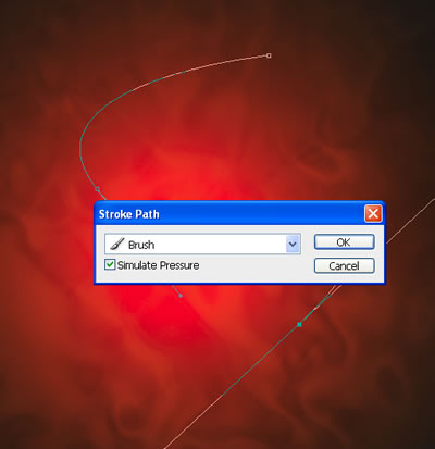 Luego haga clic derecho y seleccione "Stroke Path". Obtendrá un pequeño cuadro de diálogo aparecerá en la pantalla. Elija "Cepillo", y asegúrese de que hay una marca junto a "Simular presión". Esto es importante, ya que dará a su curva cónica extremos que hará el rock!
