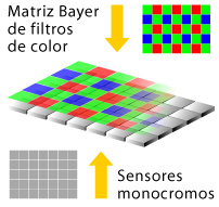 Esto se hace colocando un filtro rojo, verde o azul delante de cada píxel del sensor. La mitad de los filtros se filtran con verde y el resto con rojo o azul. Usando un algoritmo muy complejo, los valores que cada píxel registra se comparan con los vecinos y de ahí se deriva la información final sobre el color. Además, para complicar las cosas, existen cosas como la Sony F828 que usa un esquema de matriz de cuatro colores (con un verde esmeralda como cuarto color).