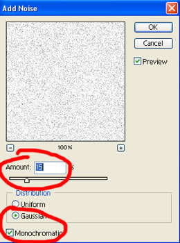 5. Y coloque 15 en Amount, Gaussian y Monochromatic.