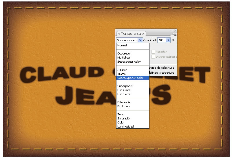 18. Copiamos la costura que hicimos con ese rectángulo y lo pegamos con las teclas Ctrl + F, con el fin que pegue exactamente encima, luego le damos una sola vez arriba a la tecla flecha arriba y a la flecha de la derecha, y le colocamos Sobreexponer Color en la ventana Transparencia, para obtener un buen efecto: