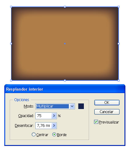 2. Damos click al menú Efecto/Estilizar/Resplandor Interior, le damos el siguiente color: C:99, M:100, Y:36, K:32, y las opciones que aparecen en la siguiente gráfica: